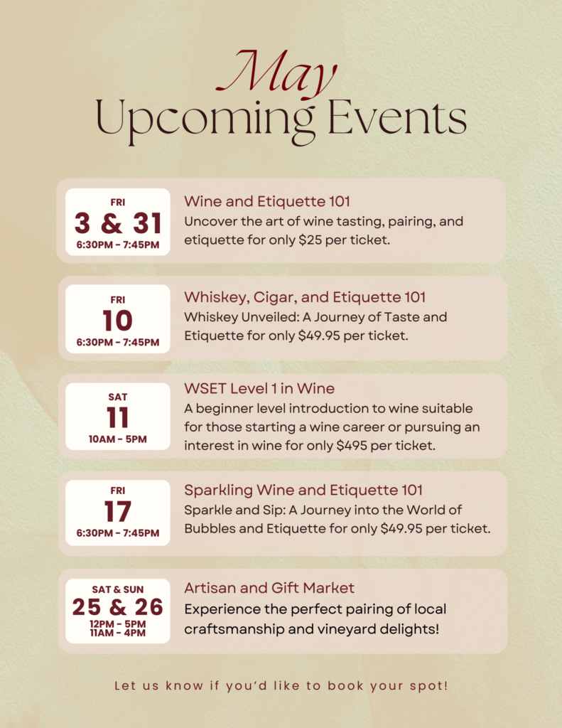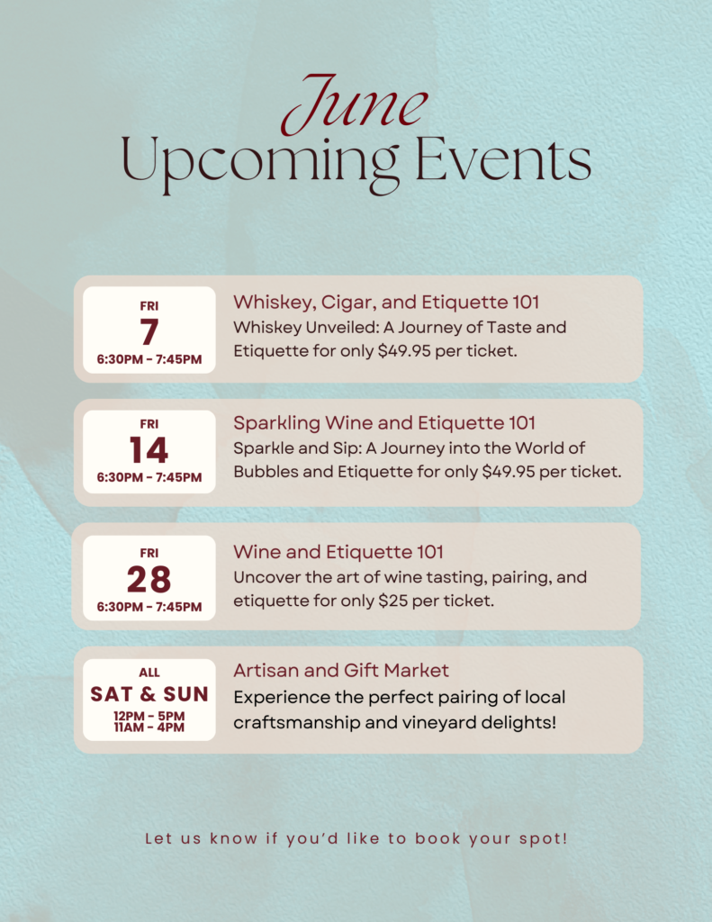 Elevate your wine experience with our ticketed events hosted right here at the winery. We have seminars for every palate and passion so if you are more of a Whiskey & Cigars or Sparkling Wine aficionado, be sure to check our events down below for upcoming dates. These special events unfold in both our inviting Tasting room and our spacious Multi-Function Room, available for your own gatherings as well.